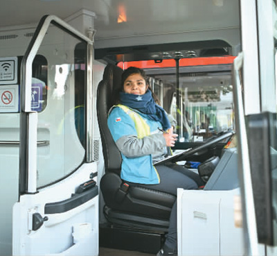 520路新能源公交车司机宝拉准备发车。