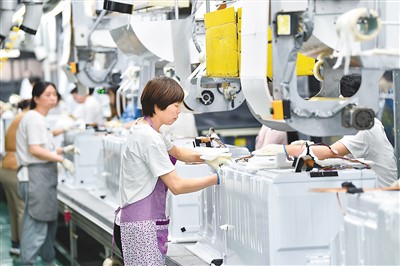 江苏省泰州市海陵工业园区大力推进先进制造业和现代服务业融合发展,形成高端装备制造、新材料、新一代信息技术“三大主导产业”。图为日前在该园区一家公司车间,工人在生产线上组装冰箱。